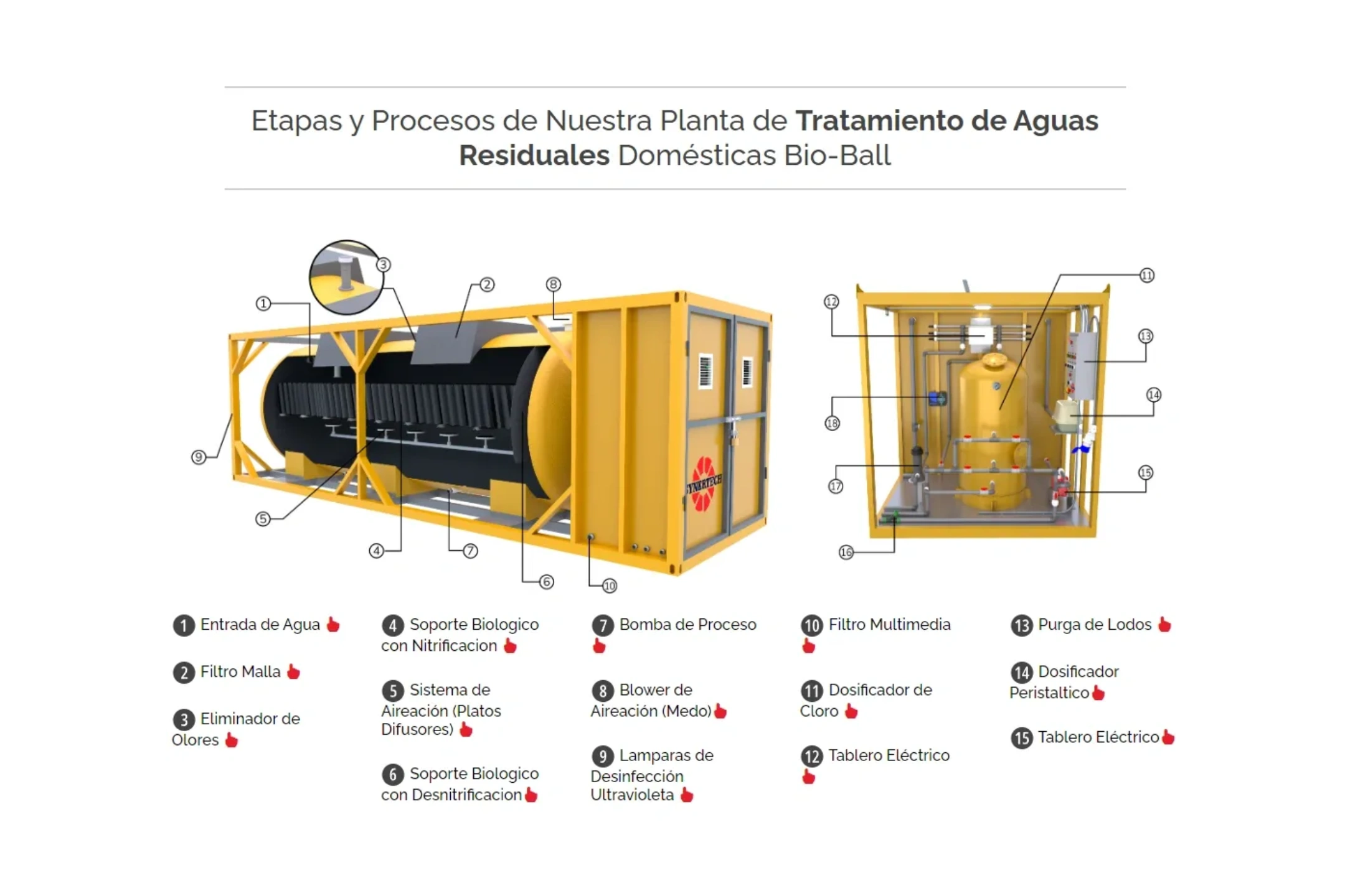 BIOBALL es una planta de tratamiento de aguas residuales, compacta y robusta que no requiere mayor experiencia para su manejo por su simple operación, su mantenimiento es prácticamente nulo. Ofrece alta calidad de agua tratada cumpliendo con las normativas ambientales actuales aplicada en: Tratamiento de aguas residuales domesticas, comerciales de mediana y alta complejidad. Su desarrollo reúne la estructuración del acero y la resistencia a la corrosión de la fibra de vidrio, es ideal para instalarse en sitios de alta salinidad, ambientes húmedos y/o corrosivos. Su instalación permite ajustarse según cada necesidad y espacio permitiendo colocarse sobre superficie. Muy bajo nivel de ruido y mínima traza de olores desagradables son su mejor carta de presentación.