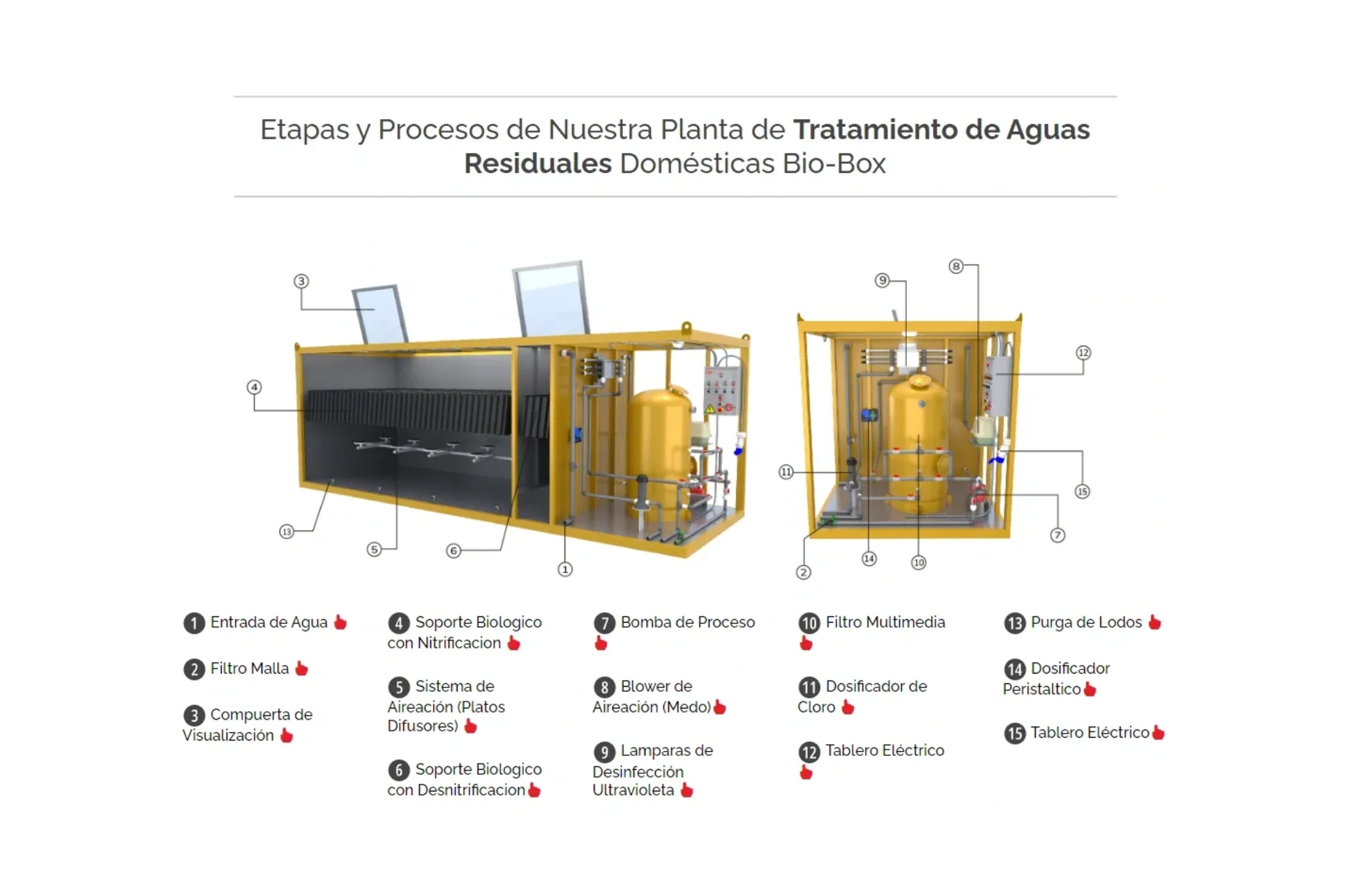 BIOBOX es una PTAR compacta contenerizada tipo paquete, incluye tecnología biológica sbr de nitrificación y desnitrificación, un modulo terciario de floculación, clarificación, filtración y desinfección que garantiza el cumplimiento de la normativa ambiental en los diferentes países latinoamericanos con las mayores ventajas: